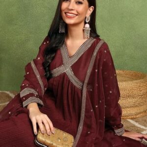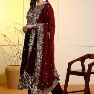 Maroon Embroidered Velvet Kurta with Pant & With Dupatta