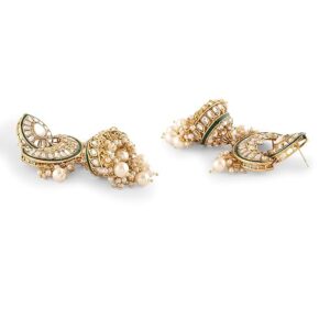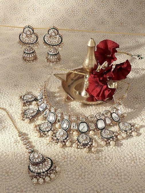 - Features :Kundan jewellery has long been a staple of Indian wedding jewellery. It is a classic type of jewellery that is made with considerable expertise and attention to detail. Kundan jewellery has a gorgeous appearance that provides a sumptuous and elegant touch to a bride-to-be’s attire. The necklace set is typically composed of a choker, a pair of earrings & a maangtikka. This set is a symbol of luxury and elegance and is the perfect accessory for the bride’s special day.