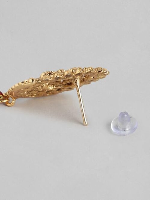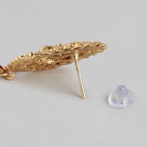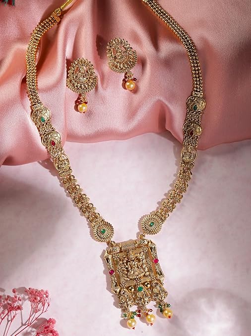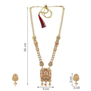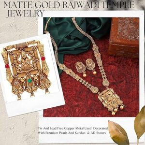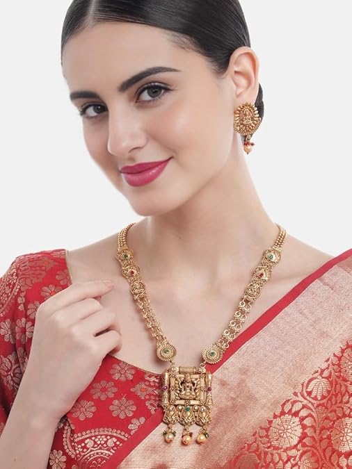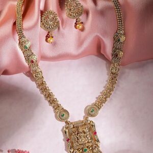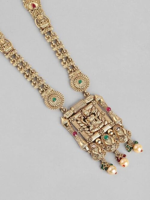 - Matte Gold Plated Maa Lakshmi Motif Rani Haar Set Adorned with Red and Green Kempu stones.